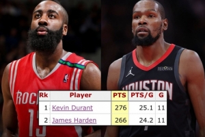 在代表火箭出戰(zhàn)的前11場比賽中,杜蘭特合計得到276分,超越哈登(266),隊史最多。