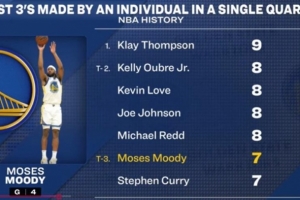 據(jù)統(tǒng)計,穆迪單節(jié)7記三分,與庫里并列歷史第三多,NBA歷史單節(jié)三分紀錄由克萊保持(9記)。