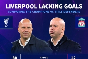 利物浦上賽季英超場均進(jìn)2.3球丟1.1球,本賽季場均進(jìn)1.6球丟1.7球