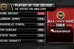 科比自媒體Kobe Bryant Stories & Motivation則曬出了一則多年前TNT電視直播畫面,內(nèi)容為NBA官網(wǎng)2000-2009最佳球員投票結(jié)果,科比得票率54%高居第一,第二的詹姆斯和第三的奧尼爾合計(jì)得票率30%。