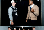德克薩斯大學(xué)橄欖球隊(duì)成員觀戰(zhàn)馬刺星三代曼寧與文班合影換球衣