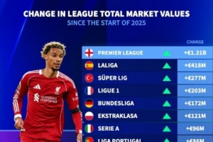 體育資訊10月25日訊 德國轉(zhuǎn)會市場統(tǒng)計(jì)了歐洲各聯(lián)賽2025年球員總身價(jià)的變化,并列出榜單,英超增加13.1億歐最多,西甲增加4.18億歐次席。