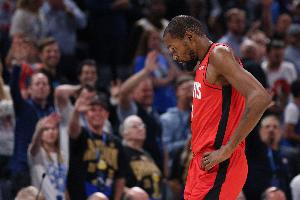 比賽最后幾分鐘的大部分進(jìn)攻回合,火箭都是由杜蘭特負(fù)責(zé)持球推進(jìn)。每一次他持球,現(xiàn)場18055名觀眾都會起身歡呼,為這位球隊新核心得分手喝彩,杜蘭特也注意到了這一點。