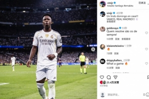 維尼修斯賽后在個人社媒曬出慶祝照片,配文寫道:“主場度過美好的周日,皇馬加油!”