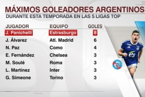 體育資訊10月27日訊 ESPN統(tǒng)計了阿根廷球員在本賽季五大聯(lián)賽中的進球數(shù)量,并列出五大聯(lián)賽阿根廷球員射手榜,斯特拉斯堡大中鋒帕尼切利8球居首。