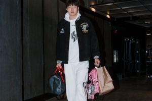 開拓者官方曬出了球員入場照,楊瀚森依然帶著自己的粉色小書包。