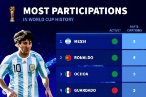 1.梅西 (阿根廷), 5屆 (2006, 2010, 2014, 2018, 2022)