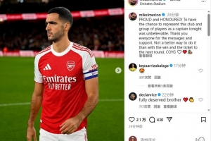 梅里諾寫道:“自豪與榮幸!今晚能有機(jī)會作為隊(duì)長代表這家俱樂部和這群球員出戰(zhàn),感覺難以置信。感謝所有人的留言和支持,沒有比用一場勝利和晉級下一輪更好的方式來慶祝了,槍手加油!????????”