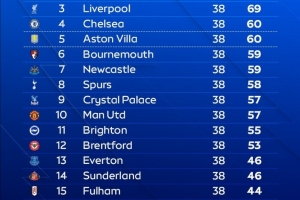 體育資訊10月31日訊 Opta數(shù)據(jù)給出了最新一期的2025/26賽季英超聯(lián)賽最終排名預(yù)測(cè),阿森納奪冠。
