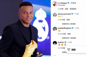 體育資訊11月1日訊 由于上賽季的出色表現(xiàn),皇馬射手姆巴佩奪得職業(yè)生涯首個(gè)歐洲金靴獎(jiǎng)。在社交媒體上,法國(guó)人發(fā)表了自己的感受,而隊(duì)友貝林厄姆則和他進(jìn)行了互動(dòng)。
