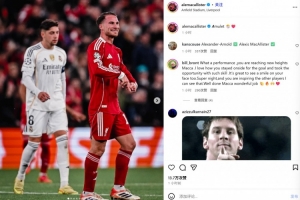 麥卡在進(jìn)球后比出“A”字母慶祝的動(dòng)作,也被很多人視為對(duì)阿諾德的“貼臉開(kāi)大”,因?yàn)檫@和阿諾德的慶祝幾乎一模一樣。