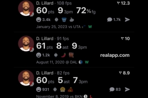其中張伯倫第一多,他一共有32次,科比有過(guò)6次,而利拉德排名第三,他有過(guò)5次60+得分經(jīng)歷。