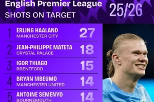 本賽季英超射正榜: