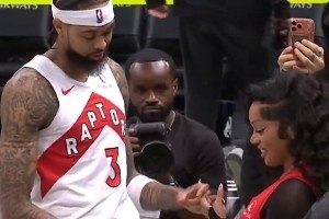 賽后,英格拉姆在場邊和歌手女友格洛麗亞在場邊秀恩愛。