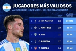 體育資訊11月15日訊 德國(guó)轉(zhuǎn)會(huì)市場(chǎng)統(tǒng)計(jì)了本期阿根廷隊(duì)名單的球員身價(jià),麥卡利斯特1億歐居首,梅西1800萬(wàn)歐排名第9位。