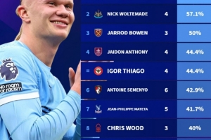 體育資訊10月19日訊 在本輪英超曼城2-0擊敗埃弗頓,哈蘭德梅開二度,本賽季英超打進11球。德轉(zhuǎn)也盤點了英超單一球員進球占全隊百分比榜單,其中哈蘭德居首,具體如下: