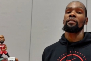 視頻中杜蘭特介紹搖頭娃娃細節(jié)。官推表示,今天前3000名入場的球迷將獲贈娃娃。