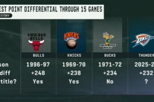 1-4分別是1996-97賽季公牛(奪冠)、1969-70賽季尼克斯(奪冠)、1971-72賽季雄鹿,本賽季的雷霆