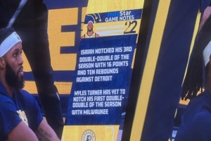 比賽首節(jié)主場(chǎng)展示以賽亞-杰克遜數(shù)據(jù)寫(xiě)道:“以賽亞·杰克遜在對(duì)陣活塞時(shí)砍下16分10籃板,拿到賽季第三次兩雙,邁爾斯·特納在雄鹿還沒(méi)拿過(guò)兩雙?!?/p>