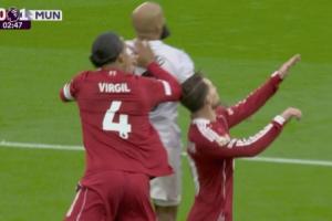 體育資訊10月19日訊 英超第8輪利物浦vs曼聯(lián),曼聯(lián)先進(jìn)一球,第1分鐘姆伯莫破門。進(jìn)球前的爭頂,范迪克爭頂中肘擊麥卡利斯特!