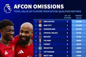 英超各隊非洲杯球員身價榜:曼聯(lián)、曼城前二位,槍手藍(lán)軍無人參賽