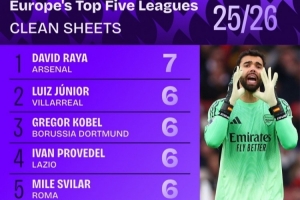 本賽季五大聯(lián)賽門將零封榜:拉亞7場(chǎng),褲襪、諾伊爾、桑切斯在列