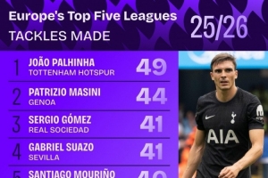 本賽季五大聯(lián)賽成功搶斷榜:帕利尼亞49次居首,馬西尼44次第二