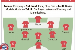 體育資訊11月22日訊 拜仁將在本輪德甲焦點(diǎn)戰(zhàn)坐鎮(zhèn)主場對陣弗賴堡,德媒《慕尼黑日報(bào)》也預(yù)測了拜仁首發(fā)。
